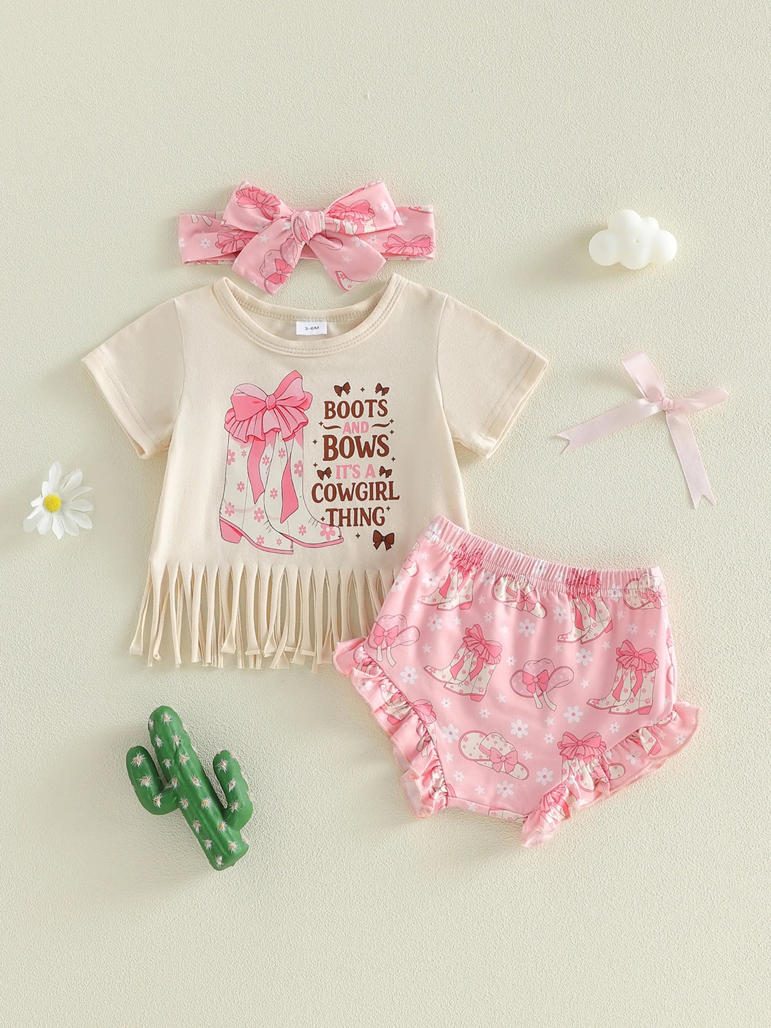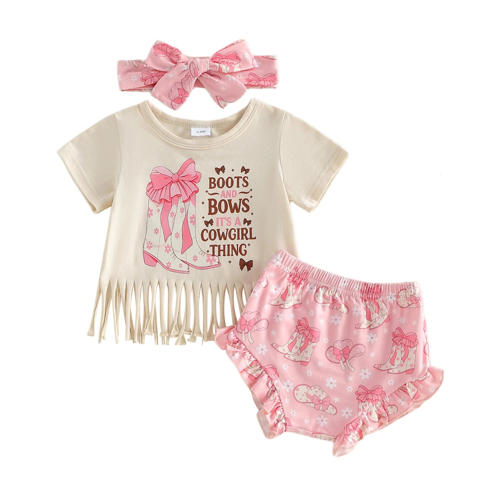Like a sun‑warmed ribbon caught on prairie grass, this tassel‑hem top—proudly declaring “BOOTS and BOWS — It’s a cowgirl thing”—with denim shorts and a ribboned headband moves with the small, bold body that wears it. Combed cotton and gentle stretch let tiny arms reach and twirl while the boots print and fringe catch the light of backyard rodeos and festival parades. Easy to dress, true to size, and made for first steps, tumble turns, and bright, laughing afternoons.