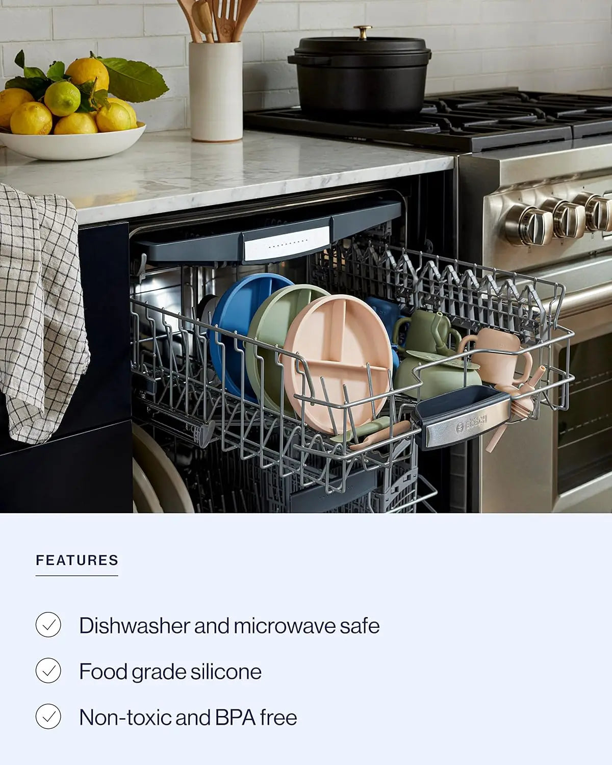 A tender table for first tastes: a complete Lalo First Bites set that cradles a new seed at the table. Soft, food‑grade silicone—non‑toxic and BPA‑free—forms a bib, two gentle spoons, a 4 fl oz cup with built‑in straw, an 8 fl oz bowl with a steady suction base, and a plate with three dividers to keep flavors like small streams apart. Microwave and dishwasher safe, each piece is made to soothe gums, encourage curious little hands, and stay rooted through messy, joyful meals.