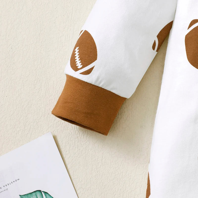 A small harvest of autumn wrapped in soft cloth — this long‑sleeved rugby‑print romper slips on with an easy zipper, like a leaf folding over a seed. Woven from a gentle cotton‑blend, it breathes and gives as little limbs curl and reach; the O‑neck and true‑to‑size cut keep comfort at the center. Practical for crisp days and cozy laps, its sporty print sings of fall afternoons and warm family gatherings. Let it be the garment you reach for when you want simple warmth, easy dressing, and a quiet blessing for the first games of life.