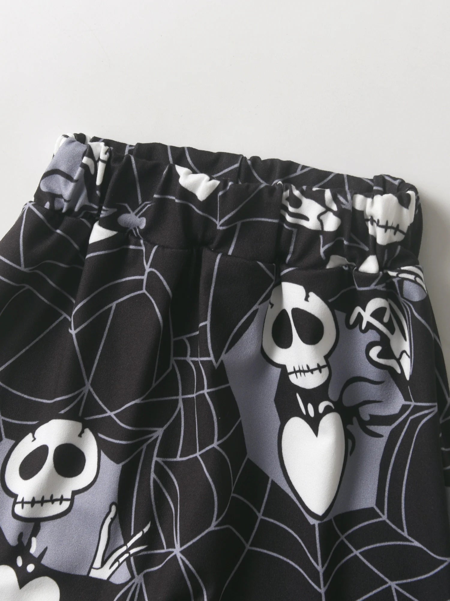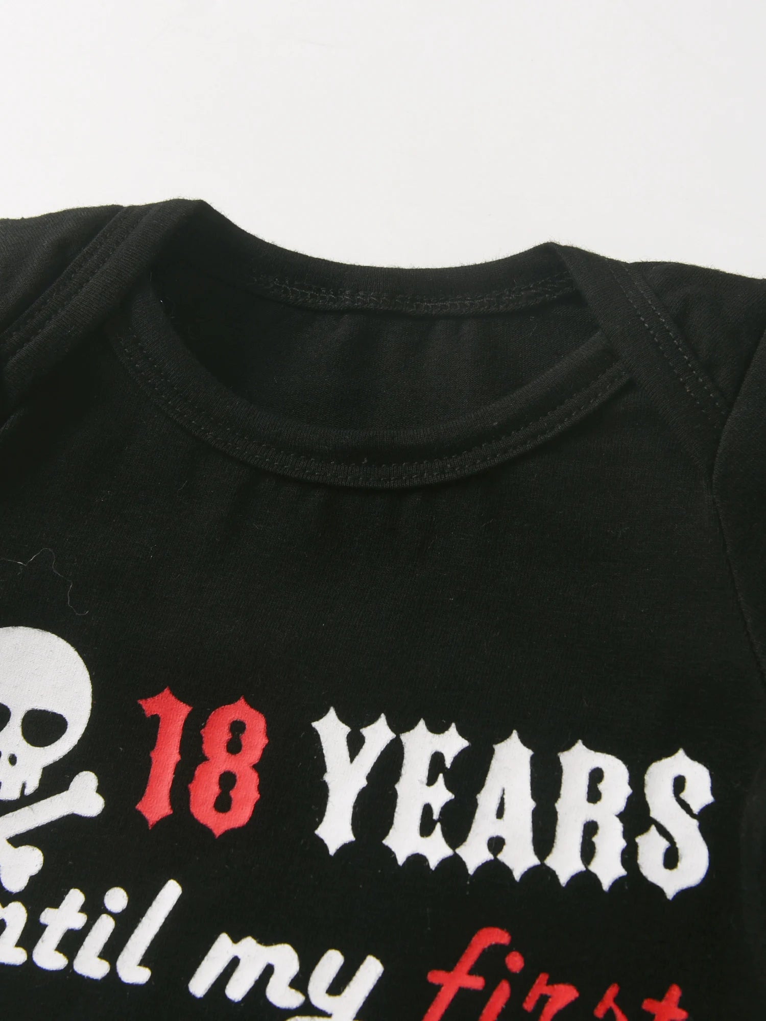 Soft as a hand at the small of the back, this black‑and‑white romper set wraps a new little spirit in playful, protective warmth. The pullover knit cradles newborn limbs while cheeky outlaw motifs—a skull and bones, a bold “18 years until my first tattoo,” white sleeves lettered “Love,” a skull‑cap, and spider‑web pants with a skeleton and heart—read like a mischievous family tale told by the hearth. It’s spooky and sweet at once, a tiny talisman of personality that keeps naps, cuddles, and first toddles cozy and true to size, a small guardian for the bright, curious work of growing.