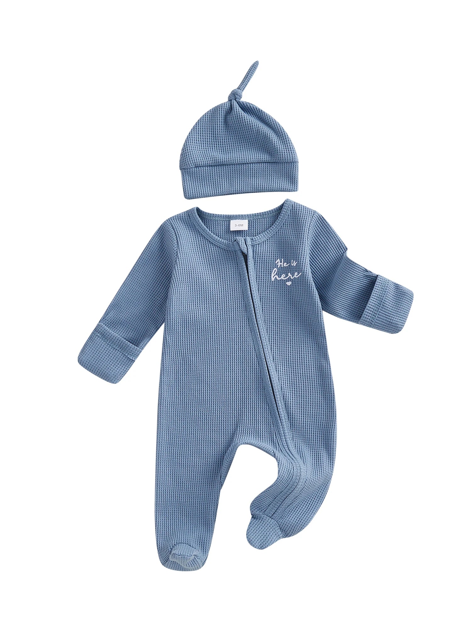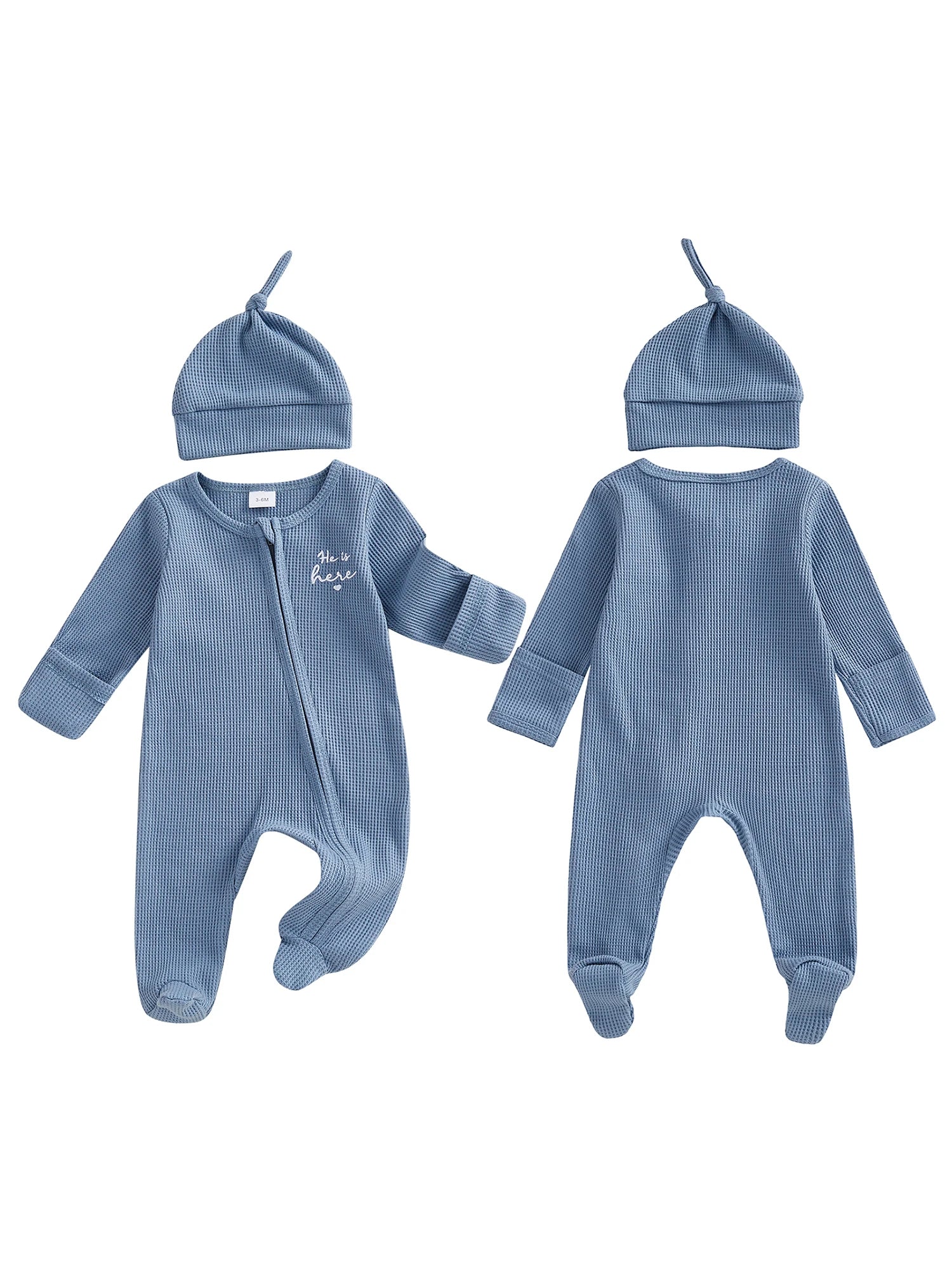 Laid out with the steady hands of an old midwife at the hearthstone, this long‑sleeve footed romper and matching hat arrive like a small blessing for a newborn’s first nights. The soft cotton‑blend cradles tender skin while embroidered letters sit like a quiet charm over the heart. Horn‑button closures make dressing a gentle ritual and the tatting‑touched weave whispers of handmade care. True to size and shaped for cozy sleep and slow morning stretches, this set in calm hues becomes an heirloom‑soft keepsake for the earliest days.