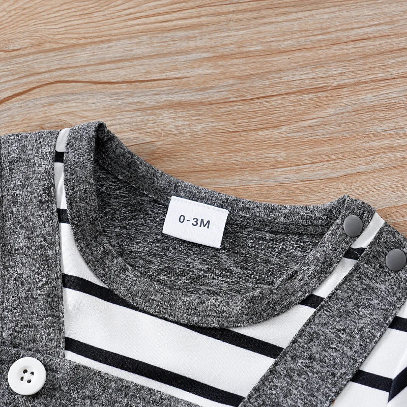 A tiny monarch wrapped in soft gray dawn—this short‑sleeved, faux two‑piece romper wears a gentle crown and the word KING like a sunbeam over a newborn field. Knit from a stretchy blend of polyester and elastane, it gives just enough give for small limbs to curl and stretch, while the printed suspenders read like vines holding a tiny heart.