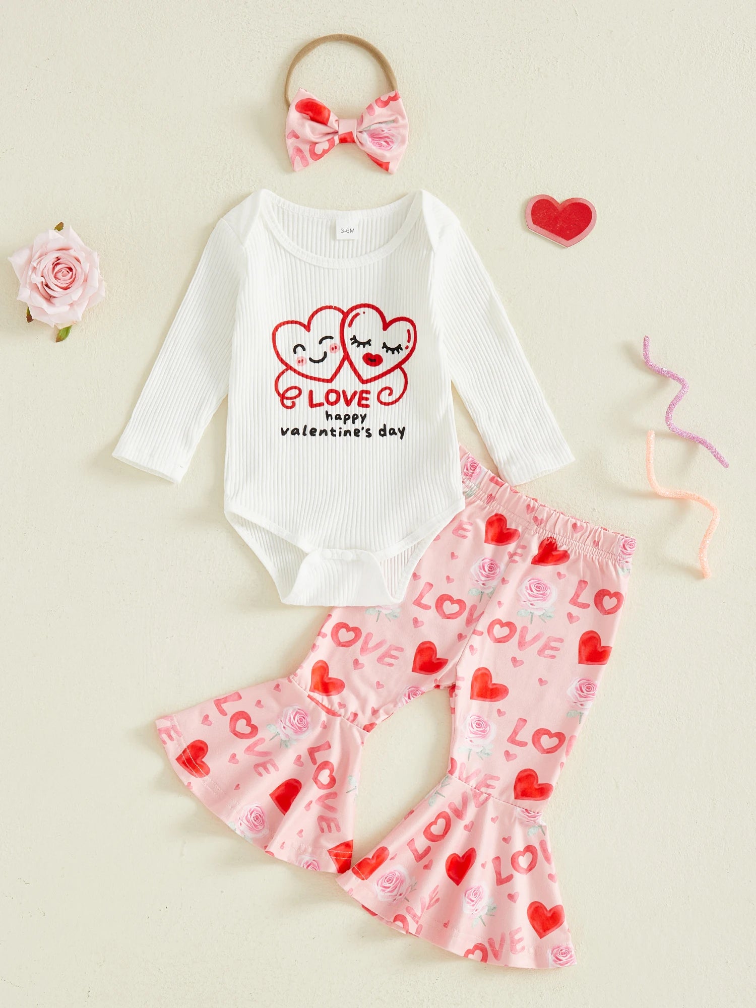 Like a small promise pressed between two palms, this Valentine’s three‑piece—white crew top stamped with two tender hearts and the words “LOVE - happy valentine’s day,” pink bellbottoms scattered with hearts and “LOVE,” and a ribboned headband—feels made for warm, laughing mornings. Combed cotton and gentle stretch move with toddles and twirls while the elastic waist and soft neckline make dressing a quiet, easy ritual. Wear it for family photos, porch picnics, and the first shy exchanges of affection; a little wearable blessing.