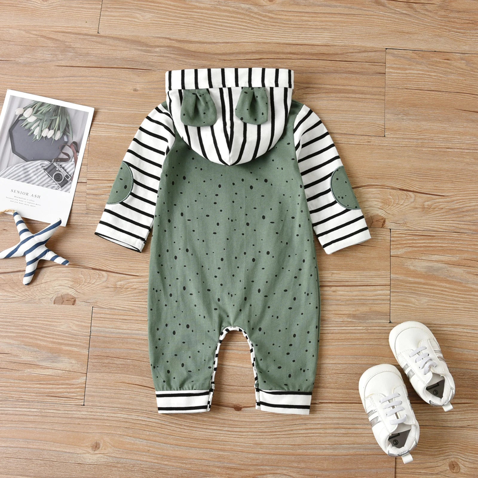 Like a small cottage tucked into the edge of a wood, this hooded romper wraps a child in the soft grammar of autumn. Cotton‑blend warmth and a hooded collar shelter tiny heads while covered buttons make dressing a calm, practiced ritual. Playful cartoon, dot, and stripe motifs in gentle green invite porchside play and stroller wanderings; the full sleeves and true‑to‑size cut fit little bodies through the 70–100 sizes. Unisex and easy to wear, it arrives as a quiet hearthstone for indoor naps and outdoor discoveries, a tender blessing and keepsake for the slow, steady work of growing.