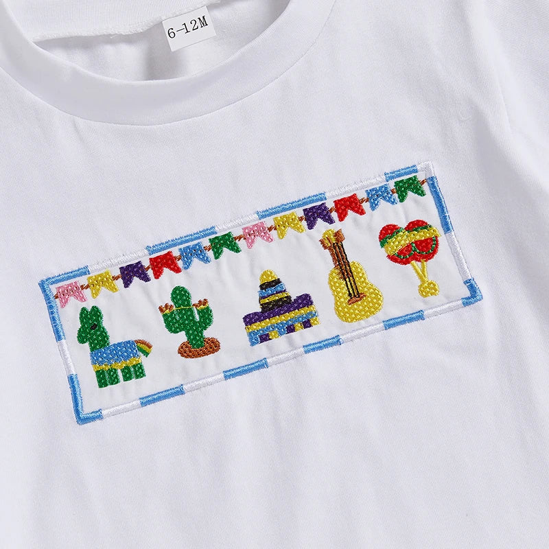 Soft as a sun‑warmed patch of meadow, this little two‑piece wraps a toddler in easy, everyday comfort. The embroidered crew neck and striped shorts are cut from a breathable cotton blend (95% cotton, 5% elastane) that moves with curious limbs and keeps skin cool through porch naps and barefoot adventures. Stitched details read like a small blessing at the hem while the waffle‑textured weave holds gentle air close to the body. True to size and made for play, it feels like a quiet keepsake—an honest, hand‑tended garment for the bright, slow work of growing.