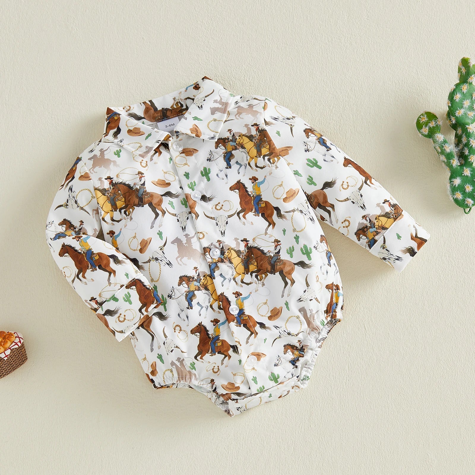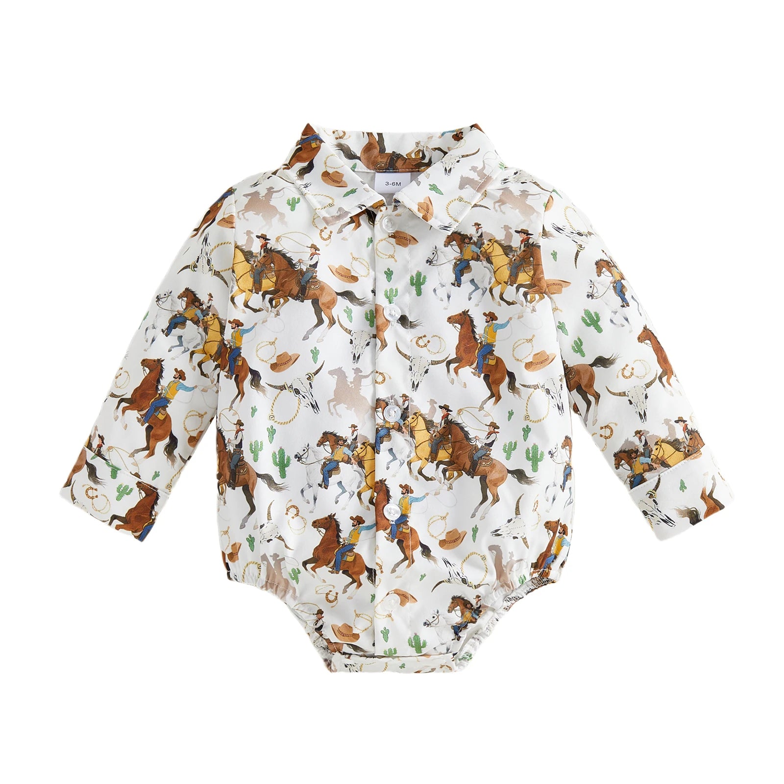 A soft, sun‑warmed blessing for little wanderers: this western collared romper wears cowgirl charm like a gentle shawl, buttoned up with a tiny, honest collar that keeps the chest warm and the spirit free. Woven from a light polyester‑viscose blend, the long sleeves and true‑to‑size cut move with a baby’s small rhythms, while the cowgirl print reads like a story told by an old porch light. Designed for babies aged 0–1 year, this single romper arrives as a simple, sturdy talisman for indoor days and outdoor afternoons—easy to slip on, easy to love, and made to hold the small, brave steps of growing.