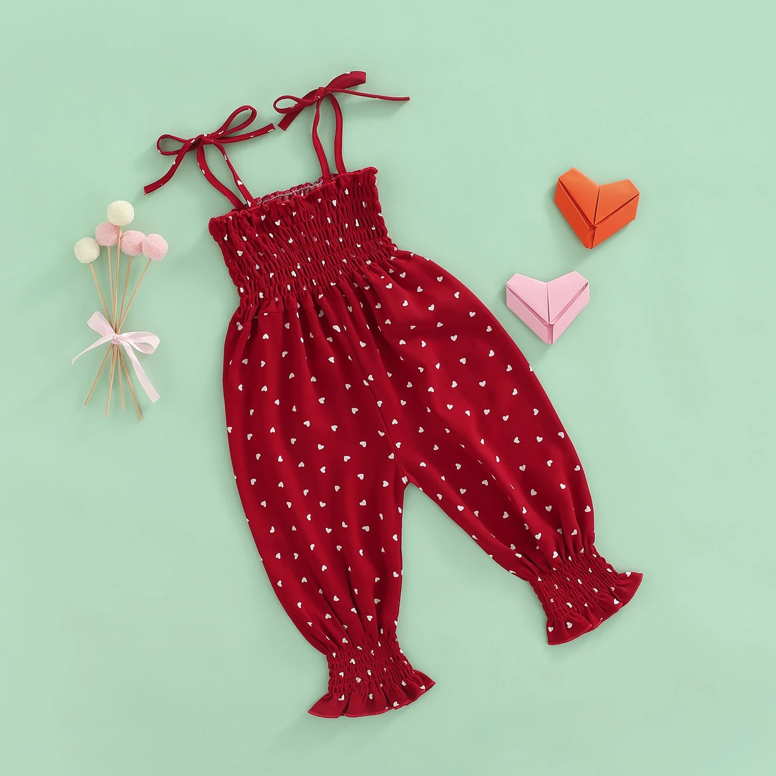 Like a petal caught on a summer breeze, this sling jumpsuit drapes a child in soft, pleated ease. Chiffon folds into tiny ruffles and a gentle tie‑up waist, while heart and leopard prints play like bright seeds across the cloth. Sleeveless and true to size, it moves with toddles and twirls, an airy keepsake for porch afternoons and quiet, sunlit mischief. Fastened with covered buttons and made for everyday wonder, it feels less like clothing and more like a small blessing—an heirloom‑soft shelter for the slow, joyful work of growing.