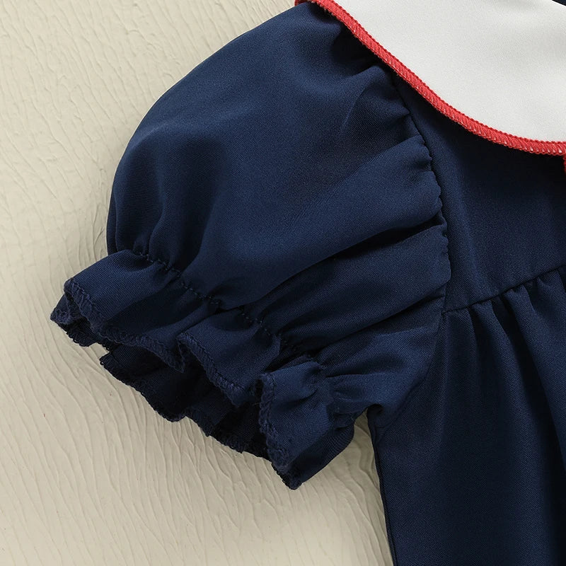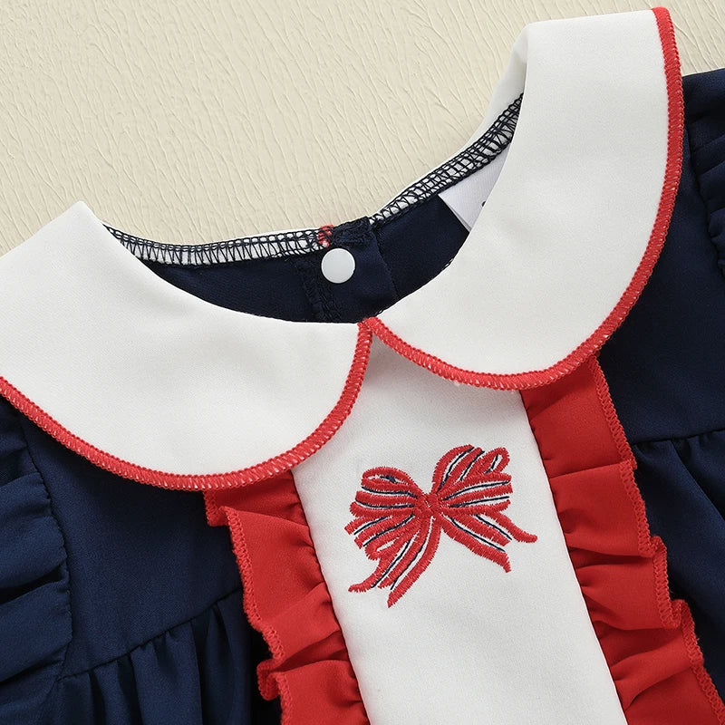 A small blessing for warm days: this Peter‑Pan‑collared romper wears a tiny embroidered bow like a garden’s secret. Soft cotton‑blend knit (95% polyester, 5% elastane) cradles newborn skin while covered buttons at the crotch make dressing a calm, gentle ritual. Short sleeves and a roomy bubble cut let little limbs kick like new leaves; true‑to‑size for 0–18 months, it’s perfect for play, family gatherings, and sunlit photographs. Reach for this piece when you want comfort, ease, and a quiet, tender smile tucked into every day.