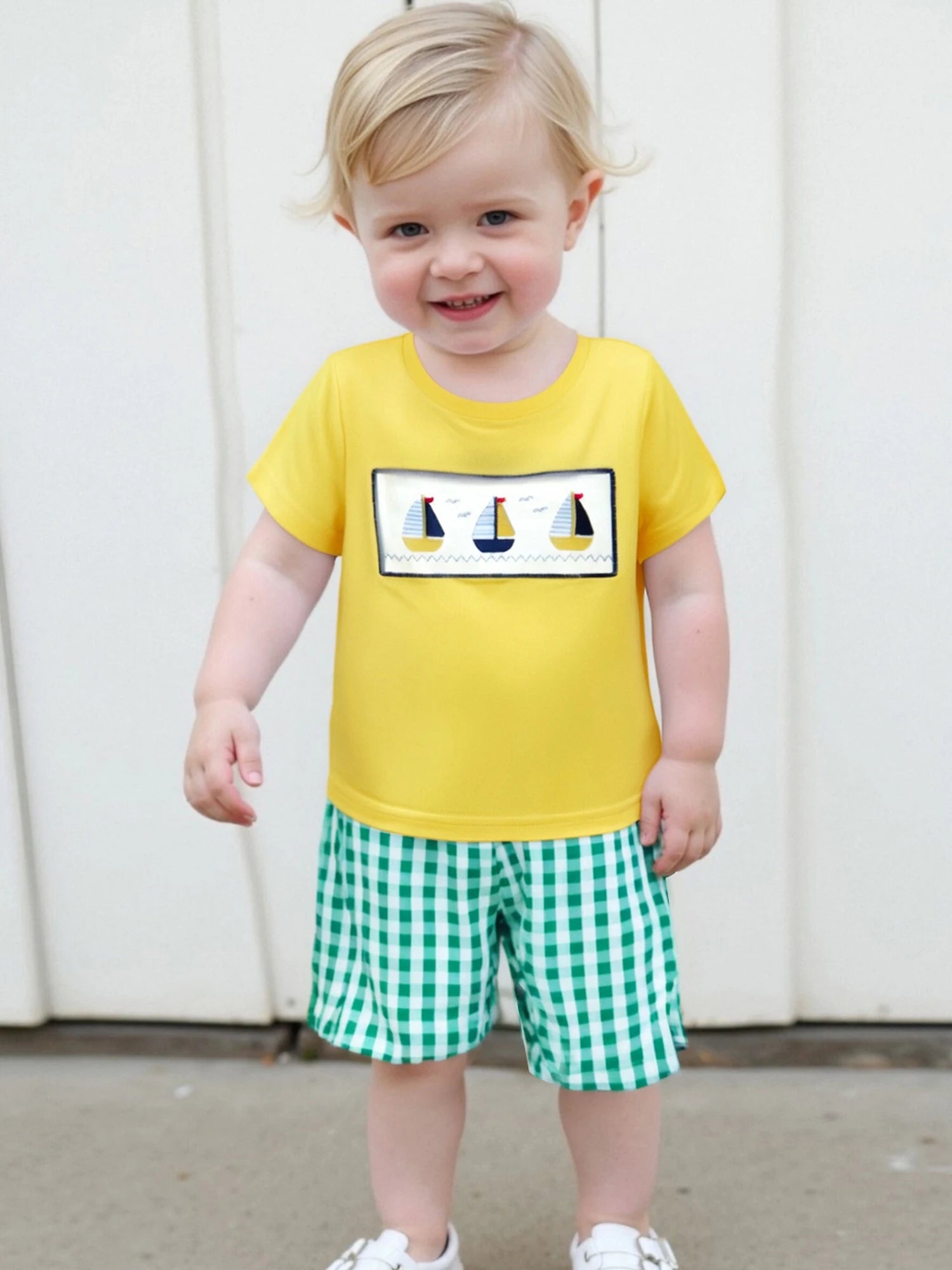 Like a small skiff finding its way to a warm shore, this yellow boat‑embroidered tee and plaid shorts set carries the easy joy of summer mornings. The soft, waffle‑textured knit with a whisper of stretch moves with little bodies—stroller rambles, sandbox kingdoms, and porchside naps—while the tiny boat stitch and classic plaid speak of seaside picnics and slow, sunlit hours. Cut for everyday play and true to size across the toddler range, it dresses a child in simple comfort and bright, honest cheer. A small harbor for warm‑weather adventures.